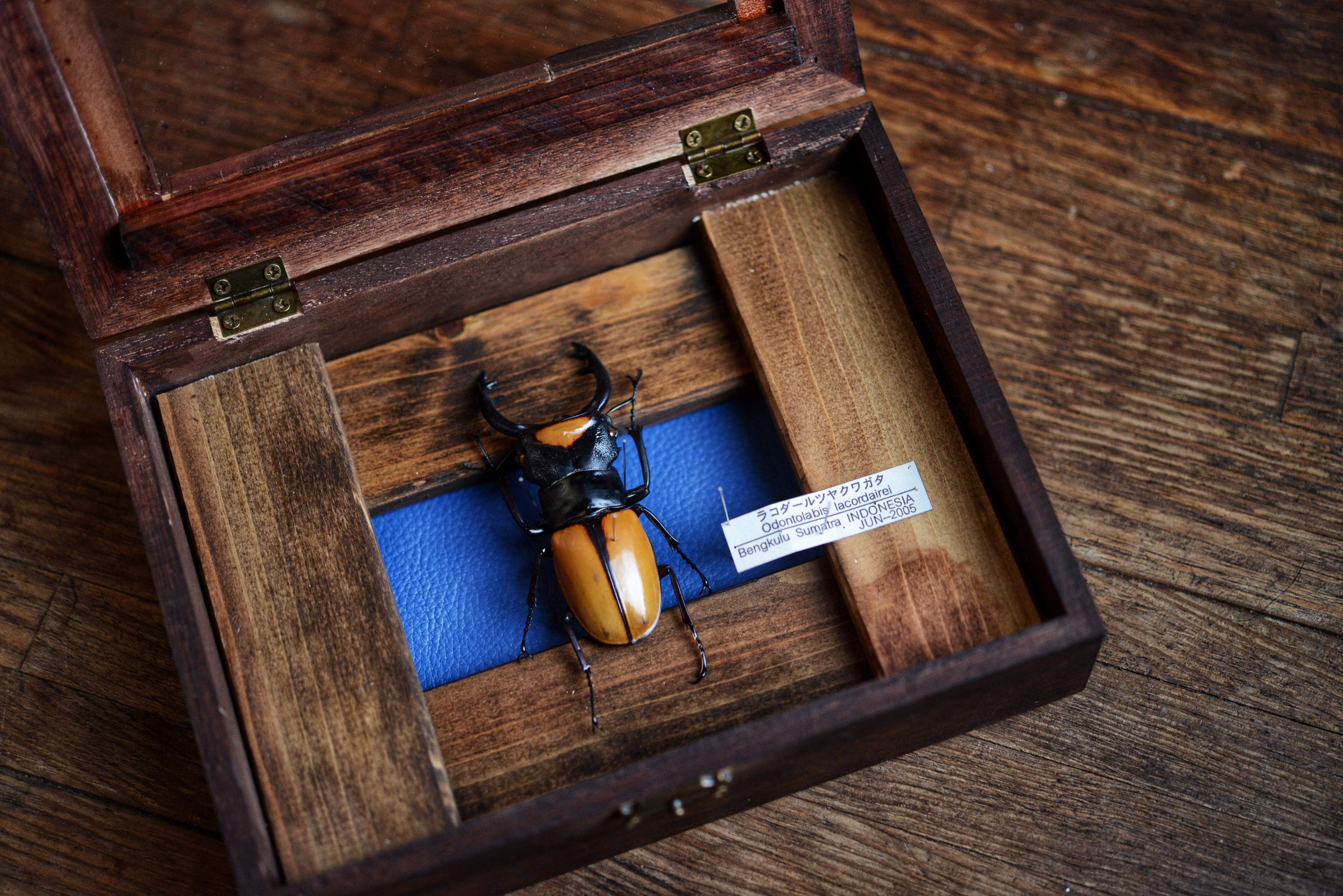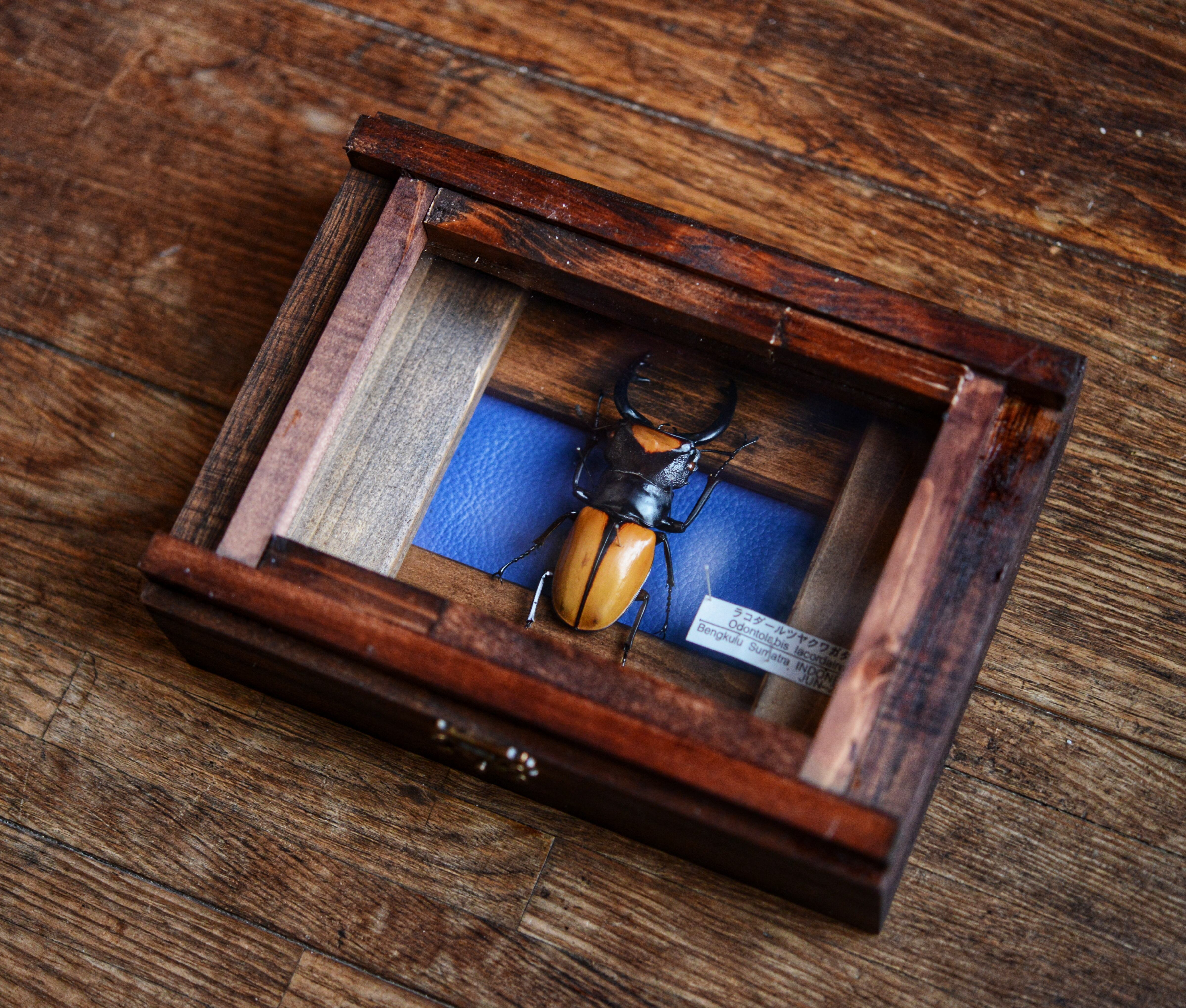 色彩を際立たせるため青のレザーを背景に張っております。